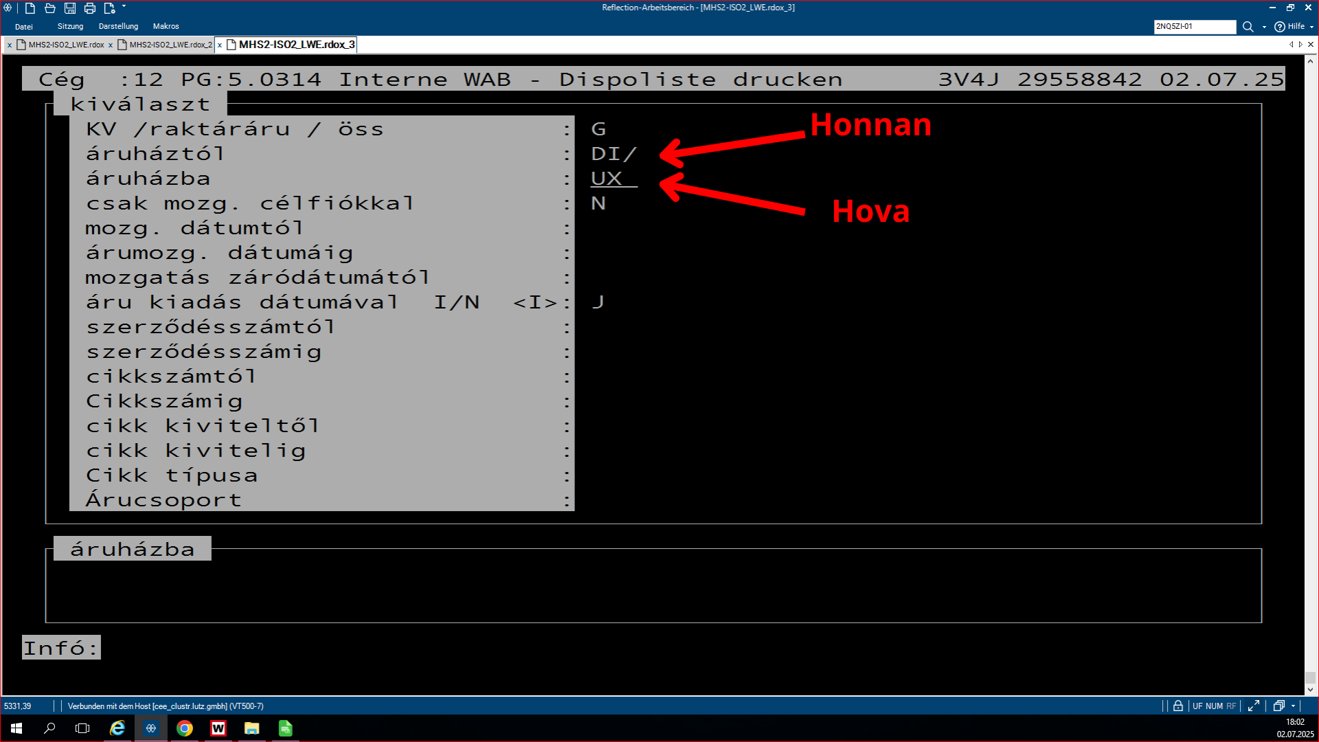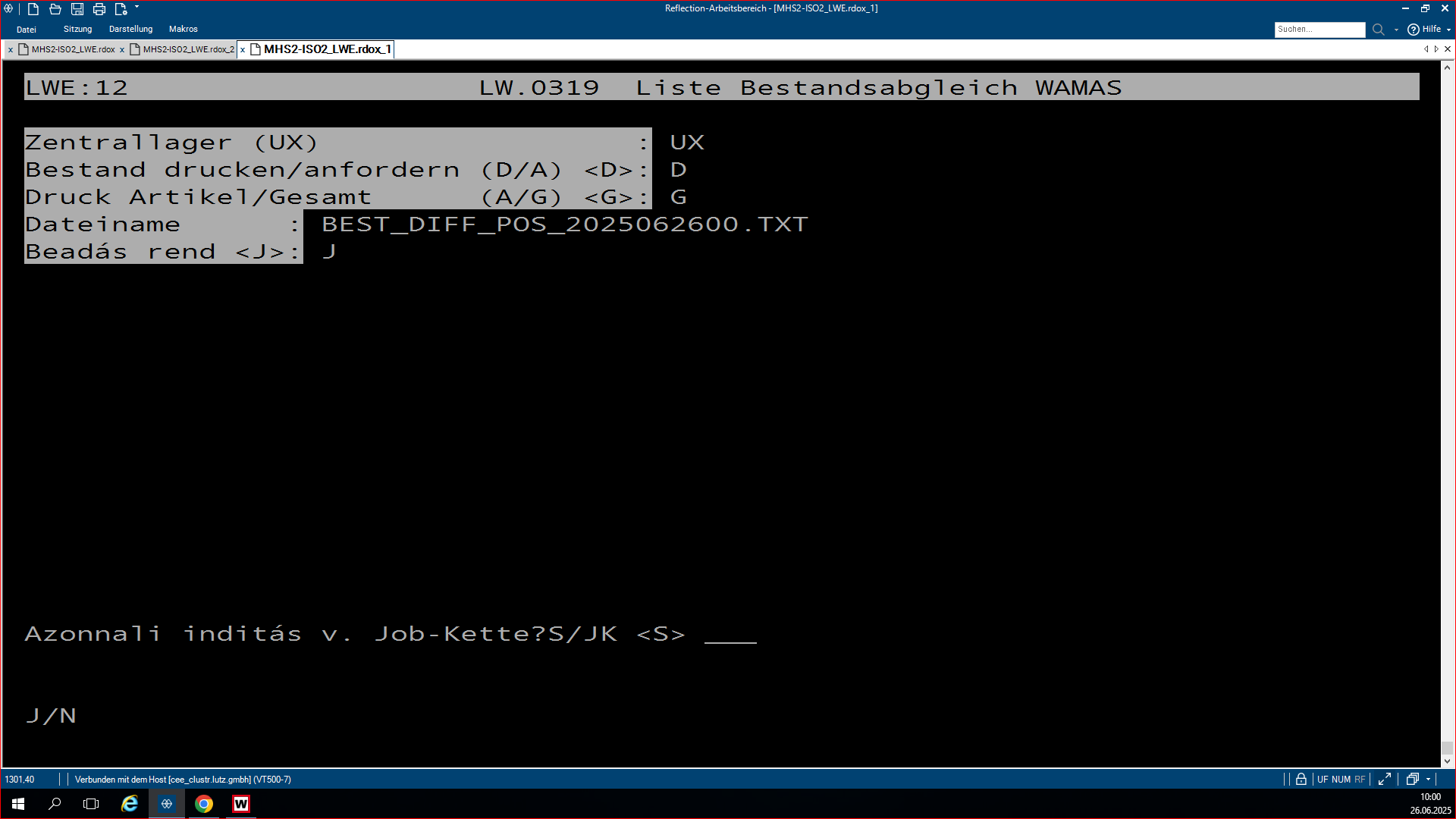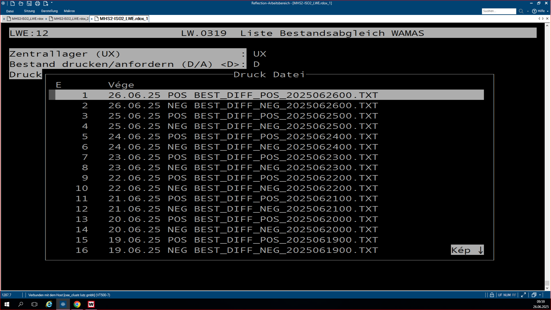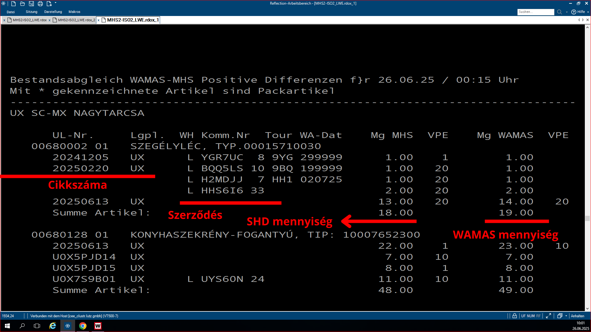A plusz-minuszos lisztsá, ami az LW.0319-es program, egy olyan program, ami azért feláll, hogy összehasonlítsa az SHD készleteit a WAMASK készletre. Az, hogy éppen melyikből van plusz, melyikből van mínusz a másikhoz képest, és ezt lehet rajta megfigyelni. A pozitív lista az a lista, ahol az SHD-hoz képest a WAMAS-ba több a készlet bizonyos termékekből. Ha megnyitjuk a programot, rá kérdez, hogy a WAMAS vagy a Metalag programmal hasonlítsa össze az SHD készletet. Ha mi azt választjuk, hogy a WAMAS-t hasonlítsa össze, akkor rá kérdez, hogy melyik áruházal, áruház rövidjelét megkérdezi. Ezután kidob kettő opciót, ott egyszerűen le enterezzük, mert nem szükséges nekünk. Ezután rá kérdez, hogy melyik napnak a listáját hozza ki, mivel ez egy jobb kettes lista, mindig éjfélkor dolgozódik fel. És megkérdezi, hogy a plusz vagy a negatív listát szeretnéd lekérdezni. Ha itt kiválasztod az adottat, amit kell neked, utána megkérdezi, hogy a beadás rendben-e. Beírod, hogy J. Aztán megmutatja, hogy melyik nyomtatóra akarsz-e nyomtatni. Ha ez csak simán leenterezed és nem írsz be semmit, akkor ezután fel lehet görgetni az shd-ban, és fölül láthatod a cikkszámokat. Hogy milyen cikkszámból mennyi van az adottból a készleten. A bal oldali oszlopban láthatjuk a shd-ben mennyi van a készleten, és a jobb oldalon pedig a WAMAS-ban mennyi van bekönyvelve. Itt látjuk így az eltérést, és ki is írja, hogy melyik vásárolói szerződésben van lefoglalva az adott áru.