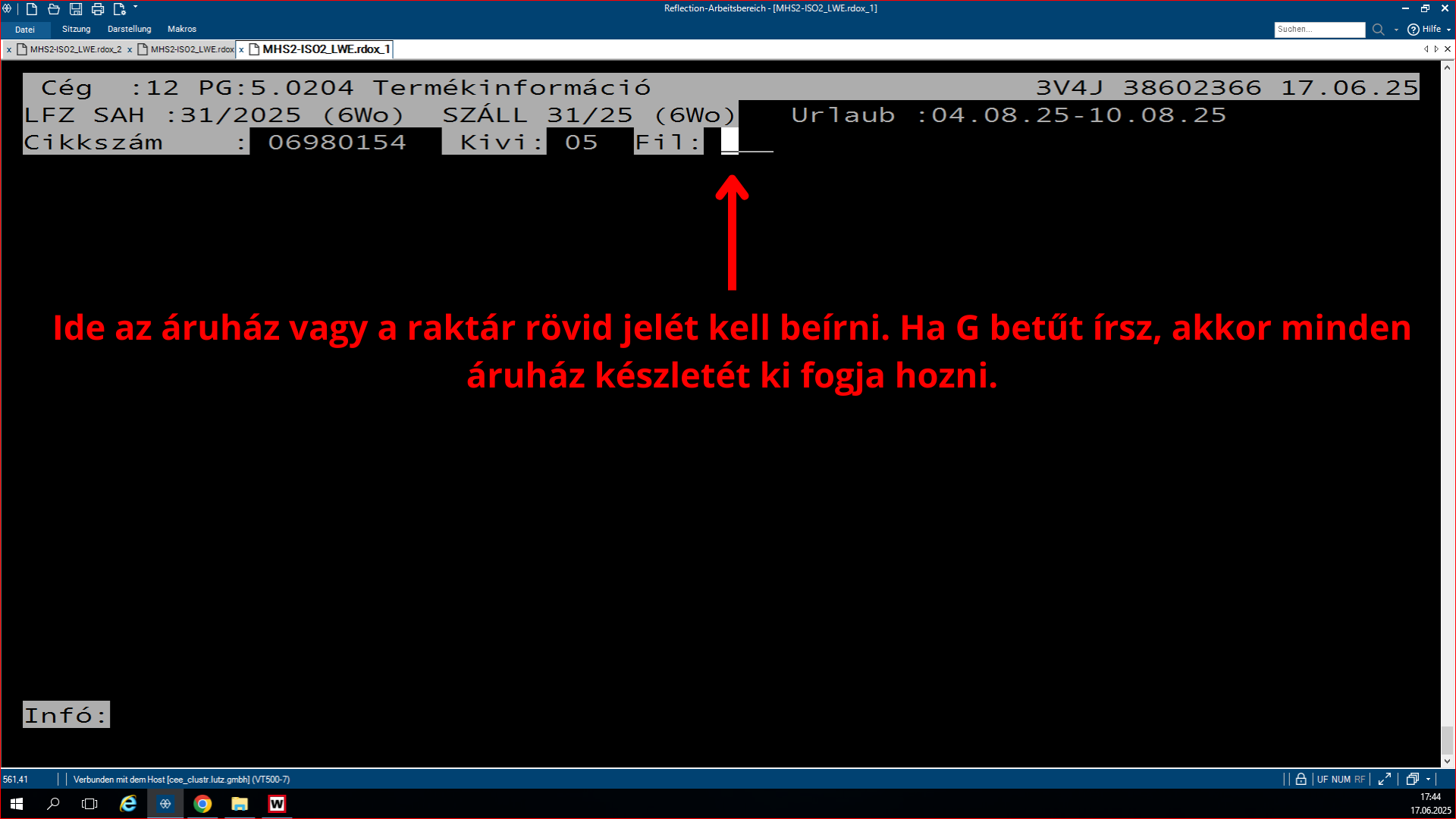 A Cikkinfo arra szolgál, hogy megtudjuk, egy adott cikkszám milyen terméket takar. Ide be kell írni a cikkszámot, amely 8 számjegyből áll (az első négy számjegy a beszállító kódja), majd meg kell adni a kivitelt, ami 2 számjegyből áll. Ha a kivitel '99' vagy 'YY', akkor a Cikkinfo nem fog releváns adatokat megjeleníteni, mivel ilyenkor a termék egyedi, és a megrendelő igényei szerint van kialakítva. Ezután van egy harmadik rubrika, a 'FIL'; ide egy 'G' betűt kell beírni, hogy minden áruházban megjelenjen.
