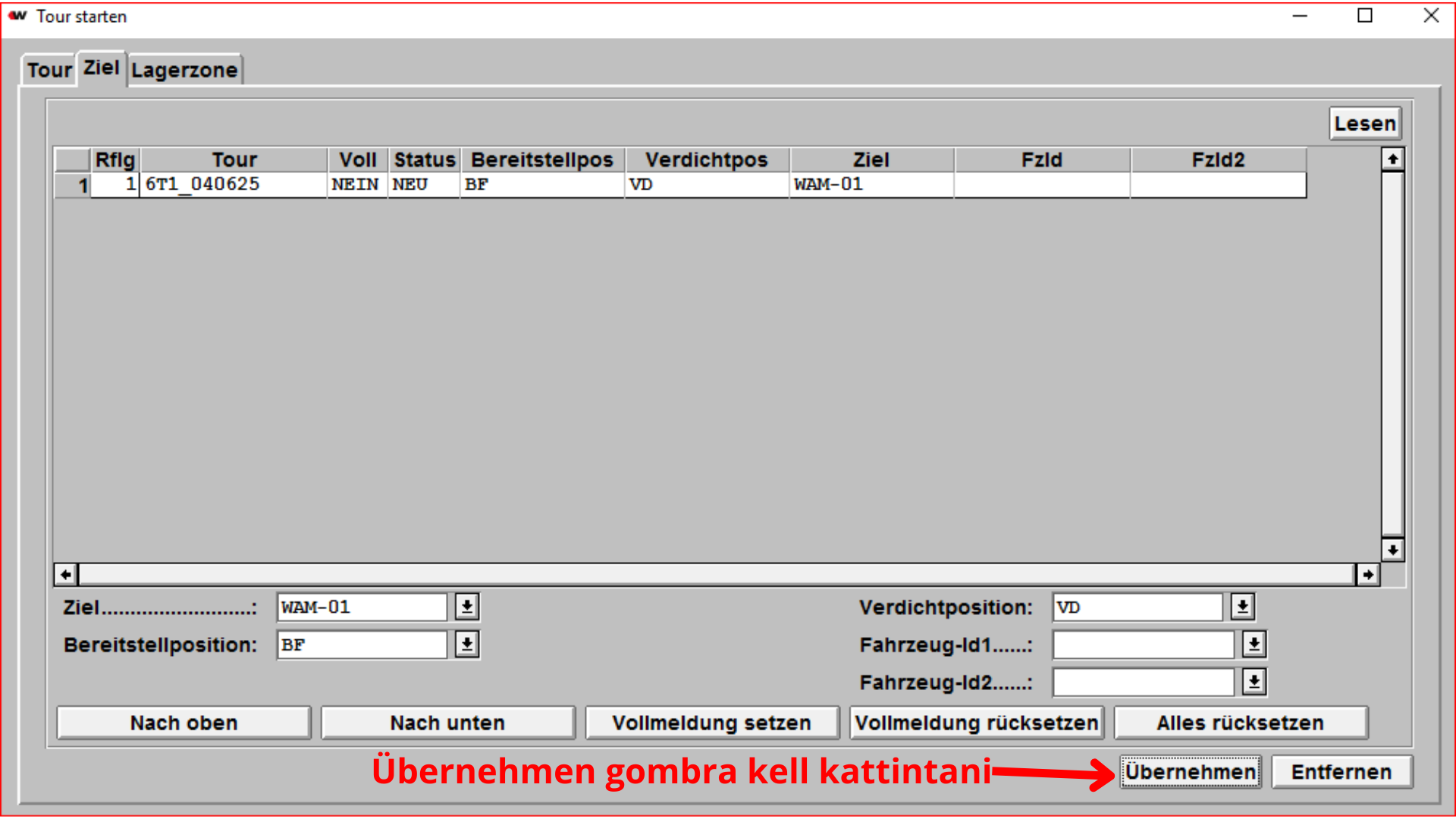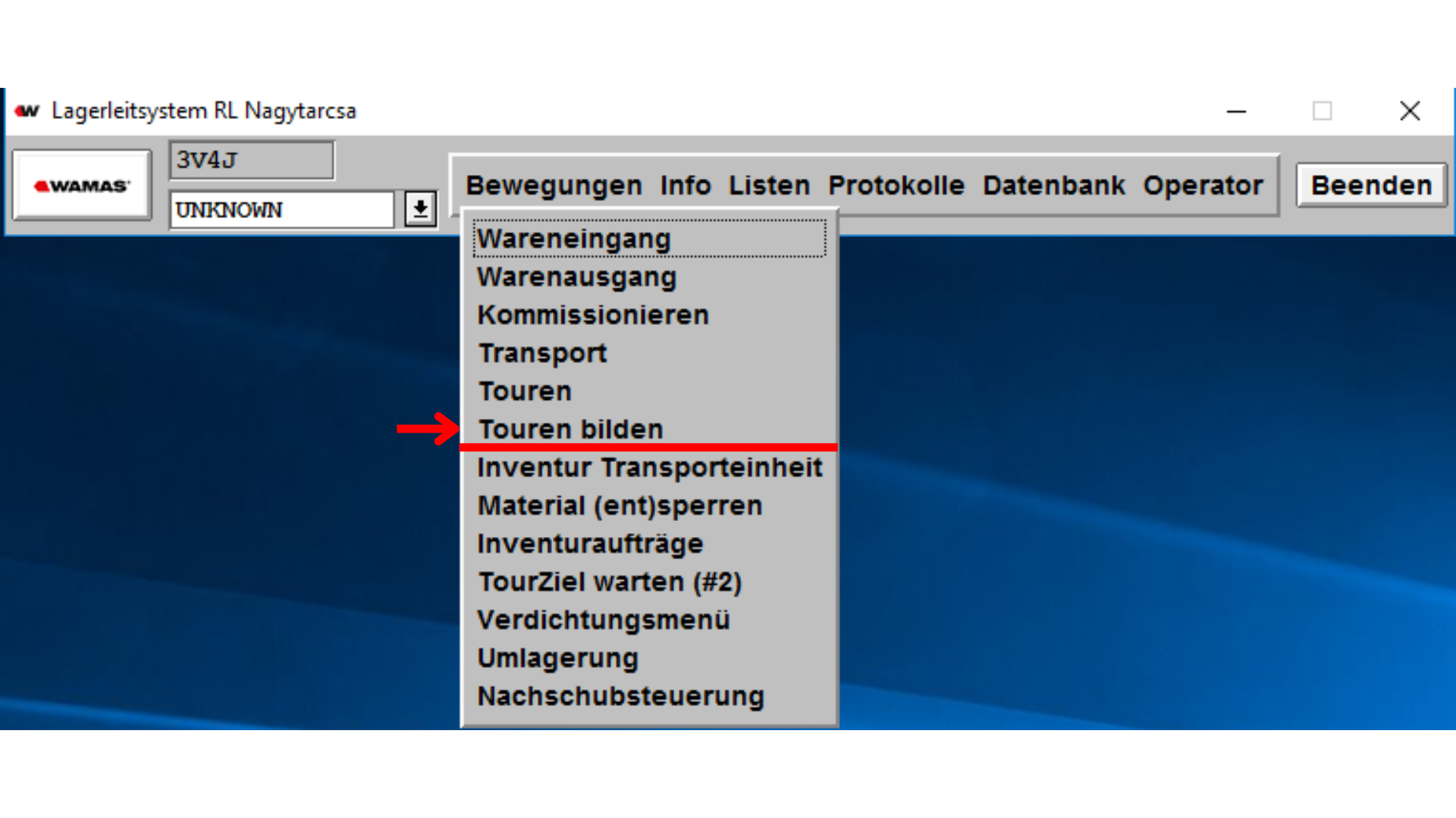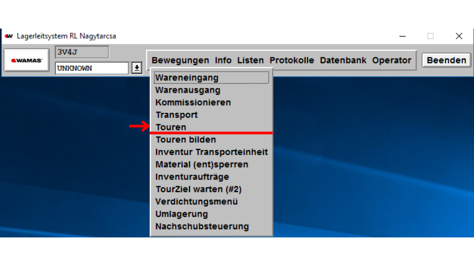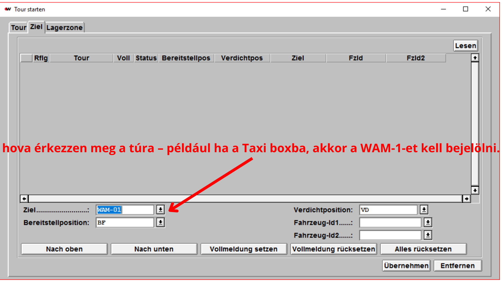 A túra indítása úgy működik, hogy be kell lépni a BEWEGUNGEN → TOUREN menübe. Ott ki kell jelölni (rá kell kattintani) egy már megépített túrát, majd a Start gombra kattintani. Ezután ki kell választani a Ziel-t, és megadni, hogy hova érkezzen meg a túra – például ha a Taxi boxba, akkor a WAM-1-et kell bejelölni. Miután ezt beírtad, a Übernehmen gombra kell kattintani, és kész is.