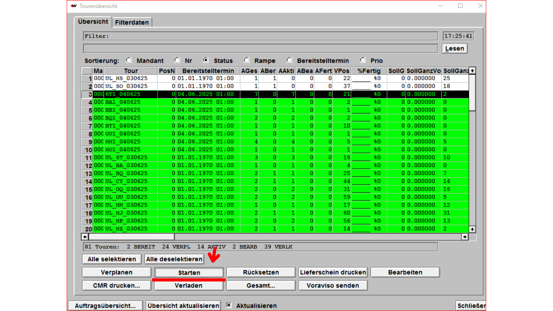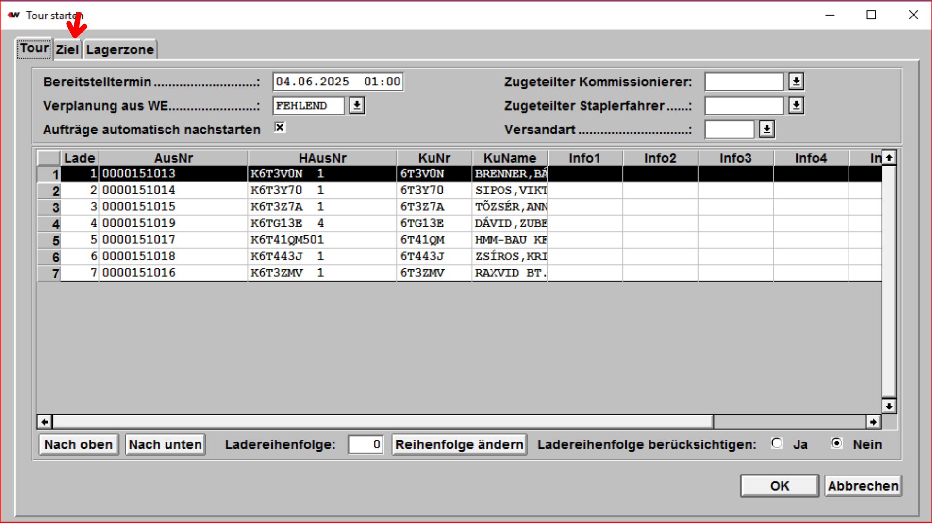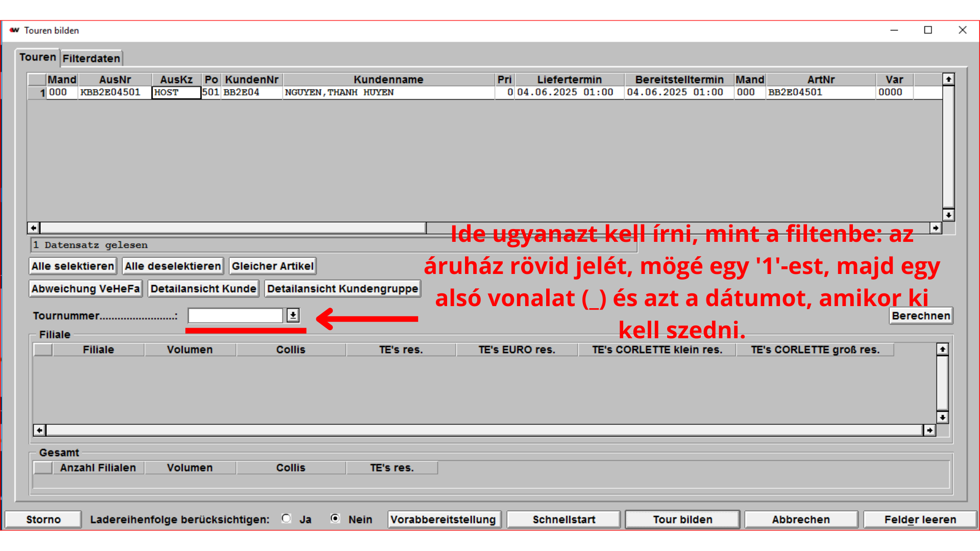 A túra indítása úgy működik, hogy be kell lépni a BEWEGUNGEN → TOUREN menübe. Ott ki kell jelölni (rá kell kattintani) egy már megépített túrát, majd a Start gombra kattintani. Ezután ki kell választani a Ziel-t, és megadni, hogy hova érkezzen meg a túra – például ha a Taxi boxba, akkor a WAM-1-et kell bejelölni. Miután ezt beírtad, a Übernehmen gombra kell kattintani, és kész is.